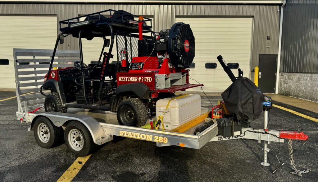 UTV-2 is a 2014 Kawasaki Mule UTV. This unit is equipped with a large structural ventilation fan. The primary use of this apparatus is for incidents requiring significant ventilation and search and rescue operations. The unit is transported using a 2014 Sure-Trac trailer.