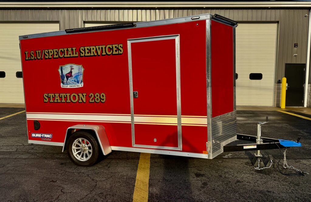 2024 Sure-trac enclose box trailer. This unit serves a wide variety of operational purposes. It is equipped with cooling fans, heaters, traffic control devices, drone operation equipment, rehabilitation (rehab) equipment, a powered hose roller, and additional support tools. The trailer was purchased through a grant from Norfolk Southern Railway.